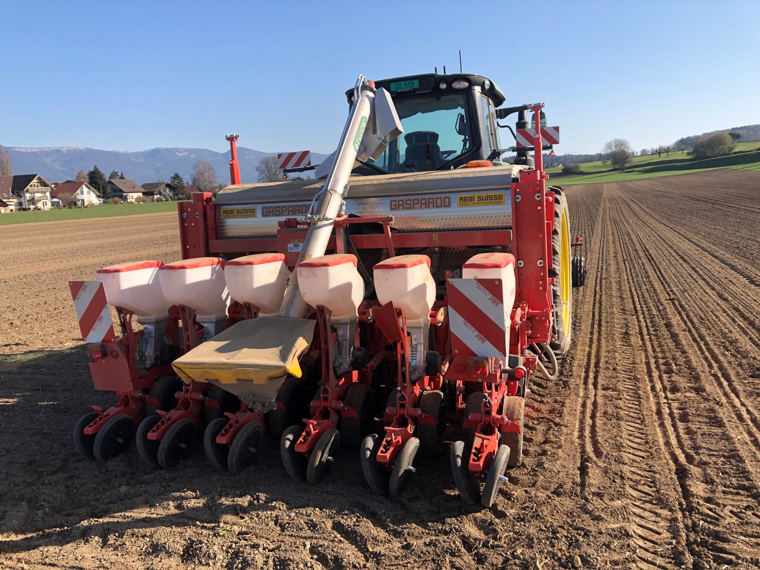 Die Sonnenblumen und Zuckerrüben werden mit einem Reihenabstand von 50 cm und das Mais im Abstand von meist 75 cm und selten 50 cm gesät. Der Kornabstand innerhalb der Reihen wird bestimmt durch die gewünschte Saatmenge pro m2. So werden die Rübenpillen in einem Abstand von 18 bis 21 cm und die Sonnenblumenkerne mit einem Abstand von ca. 27 cm im Boden abgelegt. Beim Mais welches mit einem Reihenabstand von 75 cm gesät wird, liegen die Körner rund 14 cm auseinander. Nur dank genügend Abstand der Pflanzen kann sich diese optimal entwickeln.